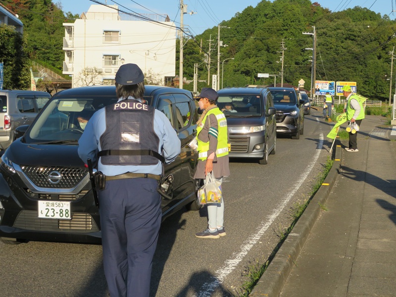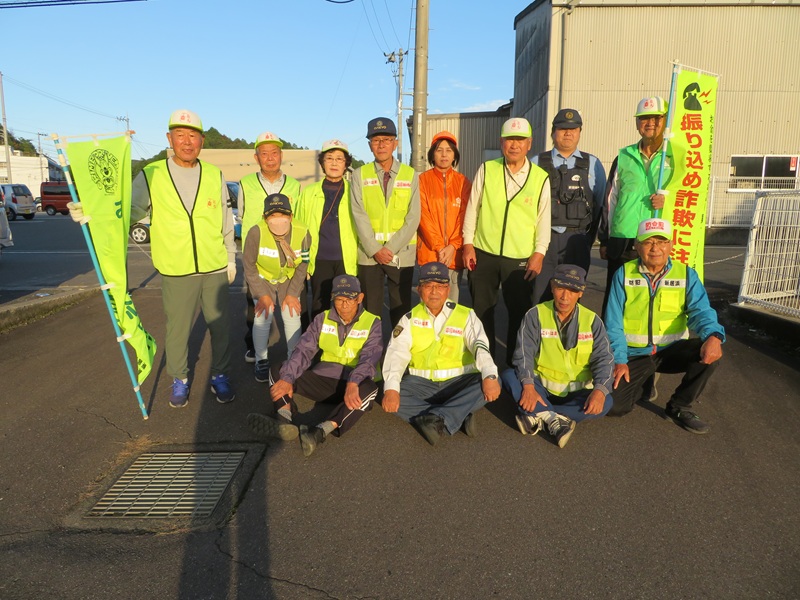 10月28日、国道11号船木地区において、船木支部が防犯茶屋を実施しました。当日は、星加支部長以下11人の支部員が参加し、新居浜警察署の協力のもと、通行車等に対して、特殊詐欺防止グッズやチラシを配布し「特殊詐欺の防止」や「少年非行防止」を呼びかけました。