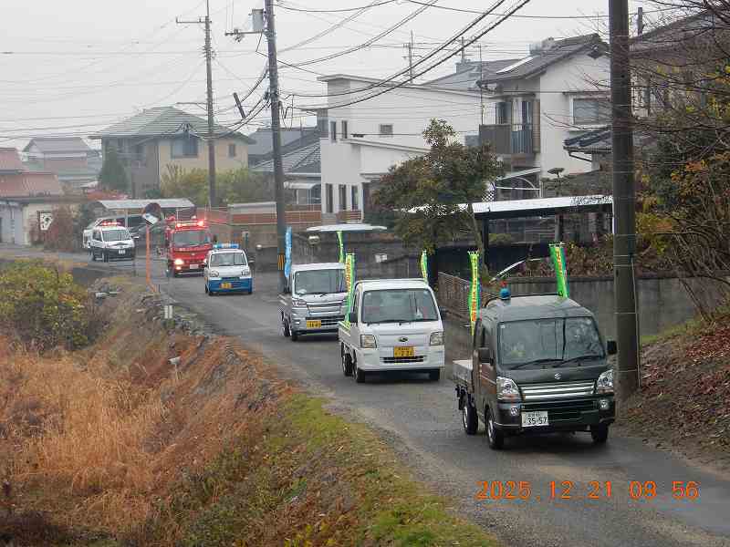 12月21日(日)に船木支部が、交通安全協会、消防団、婦人部等と協働で、年末の防犯・交通安全・防火の広報パレードを実施しました。当日は、船木公民館を出発し、船木小学校校区内を一巡して特殊詐欺の防止、交通事故の防止、火の用心を広報しました。