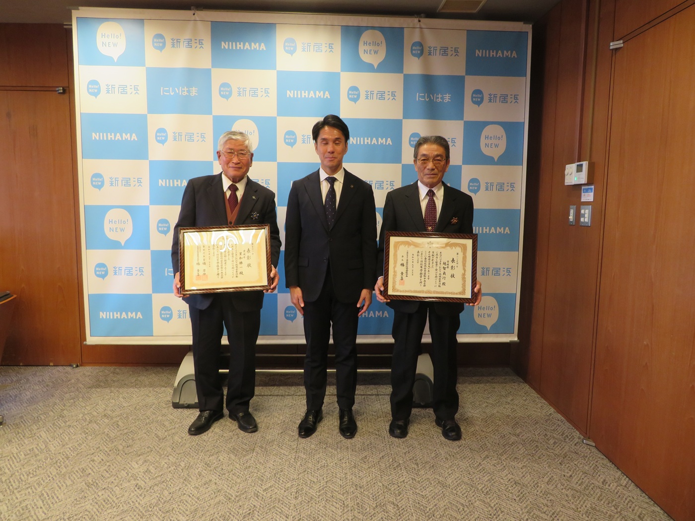 2月19日新居浜市役所において、本年度全国表彰を受賞したお二人が、会長に受賞報告しました。会長からは、長年の防犯活動に対する賛辞の言葉がありました。おめでとうございます。←「特殊詐欺防止「おせっかいキャラバン」で広報を実施」前の記事へ 次の記事へ「令和7年防犯白書」→